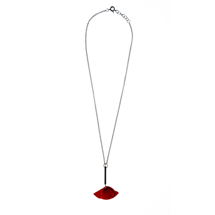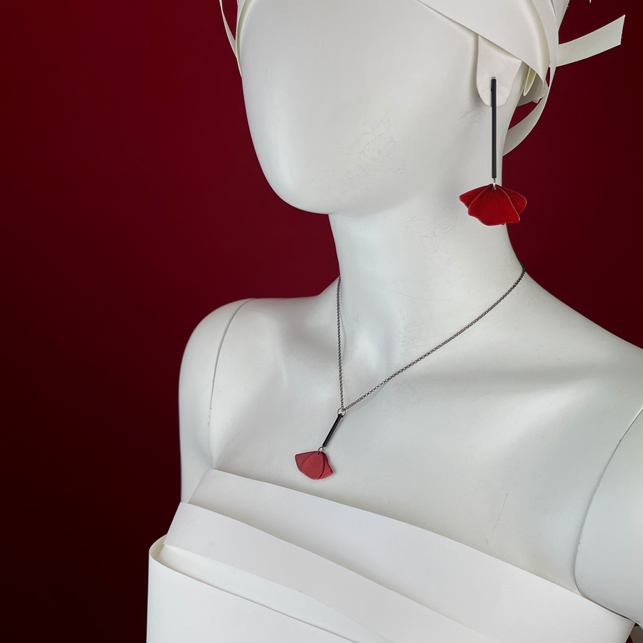 Gioielli in ottone verniciato a caldo e argento, assemblati e decorati a mano. La collana Poppy fa parte della collezione Herbarium, leggere tracce di natura che diventano segno, dettagli che prendono forma.