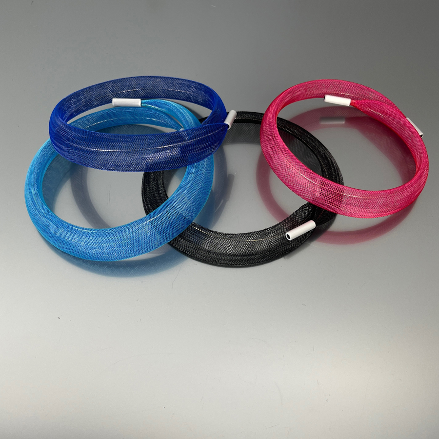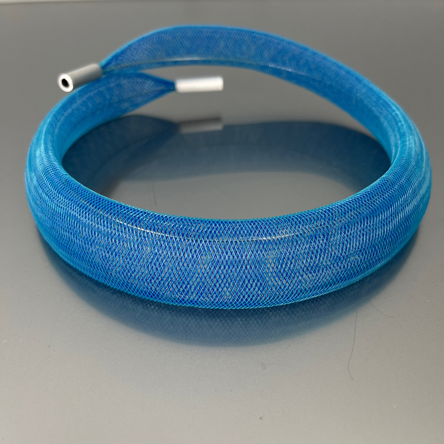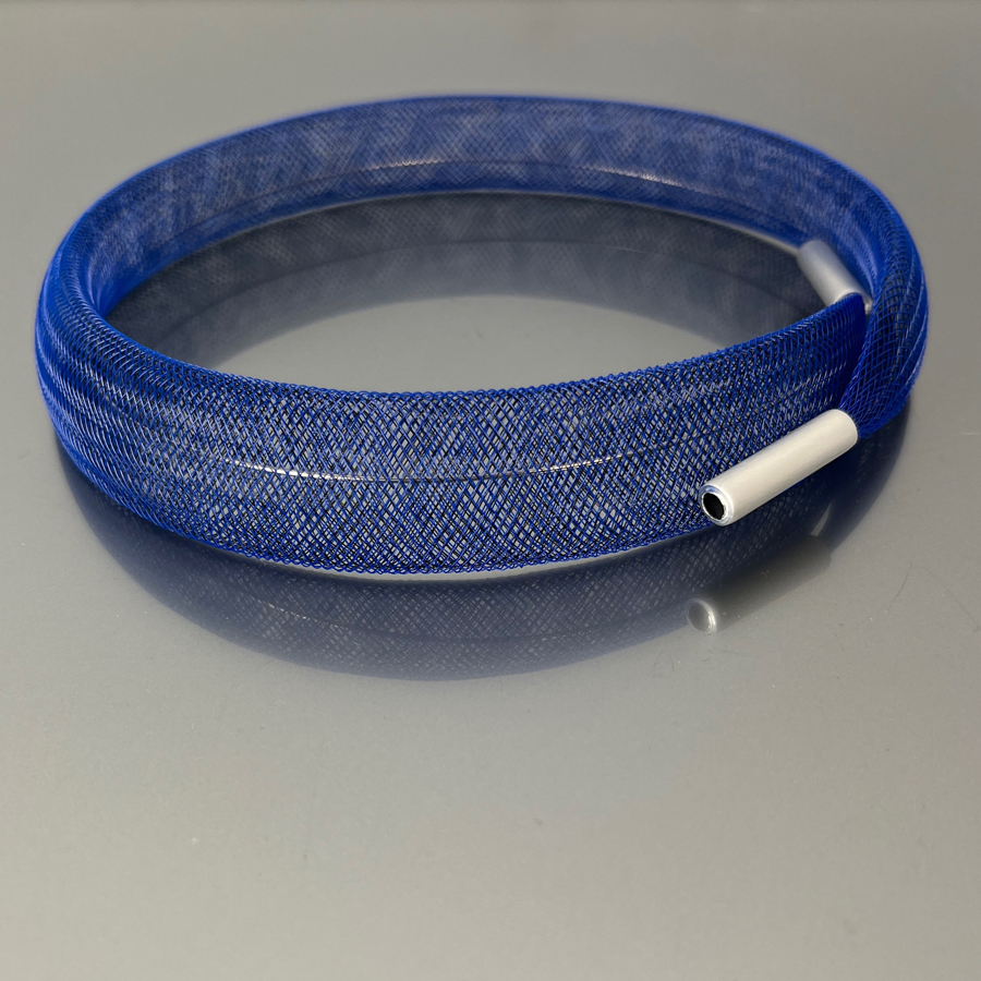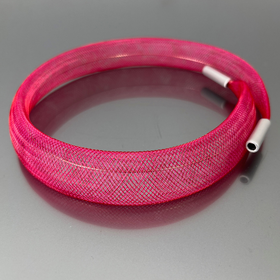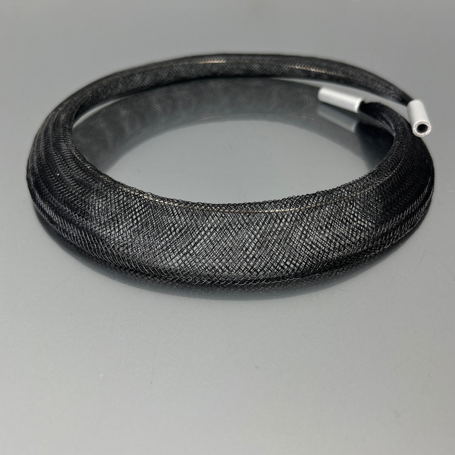 Rete in nylon con all’interno un filo in acciaio armonico che rende la collana molto facile da indossare senza farle perdere la forma.