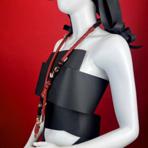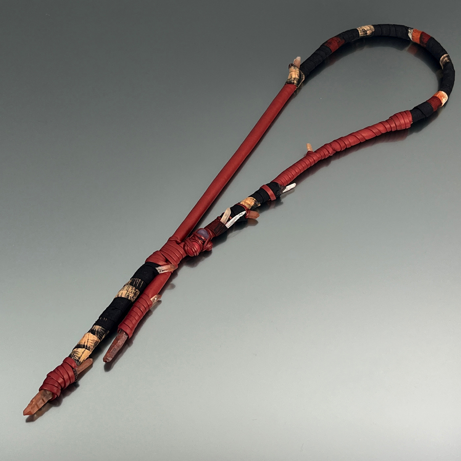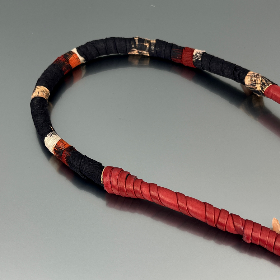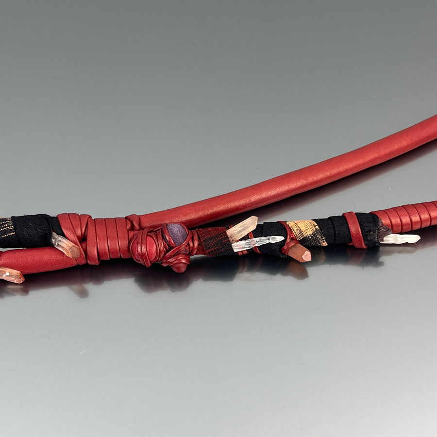 Collana lunga in pelle, quarzi e tessuti giapponesi.