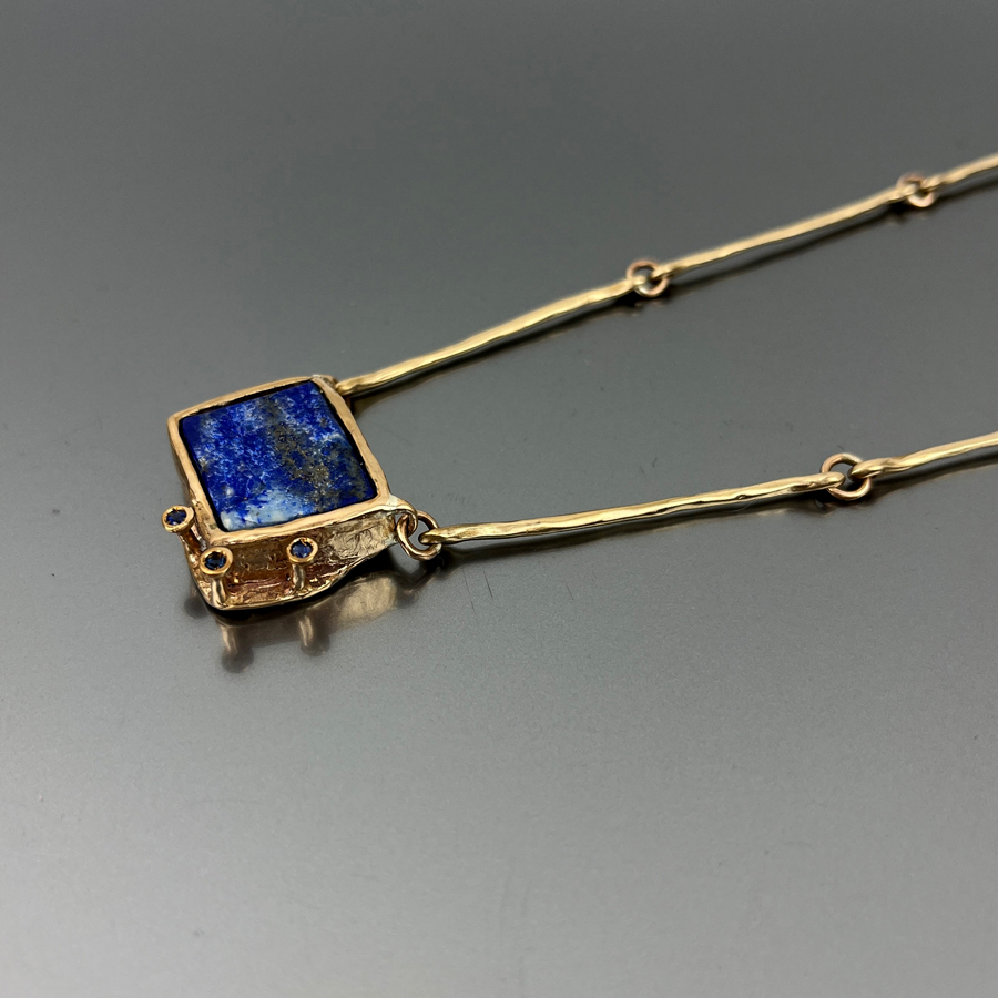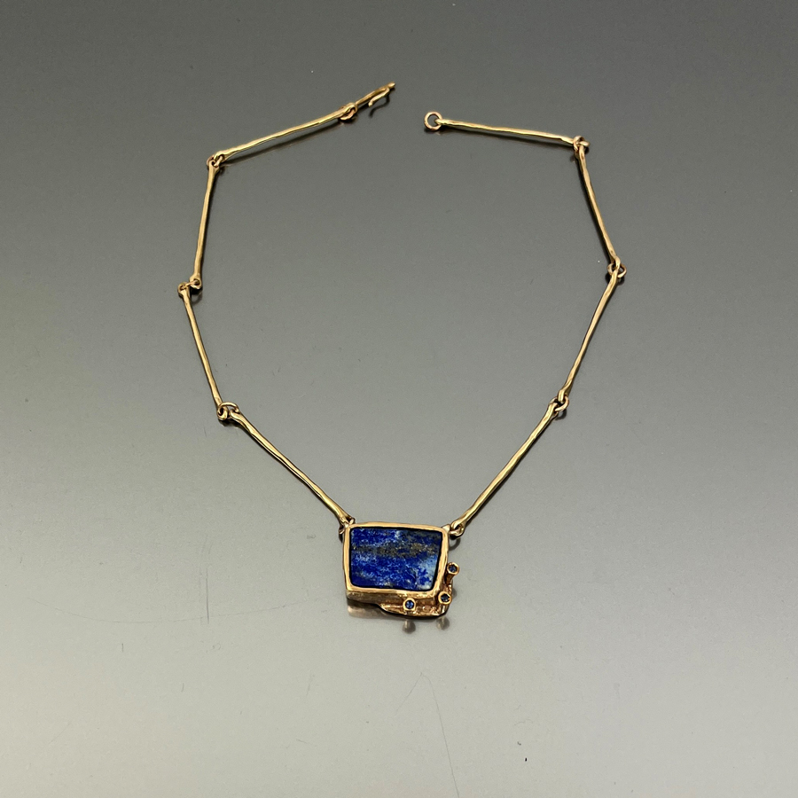 Collana catena in bronzo, con elemento centrale in Lapislazulo e tre piccoli Zaffiri .
