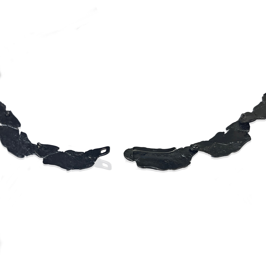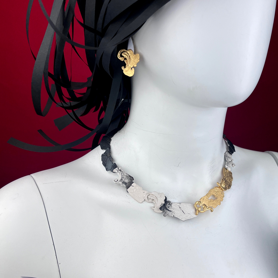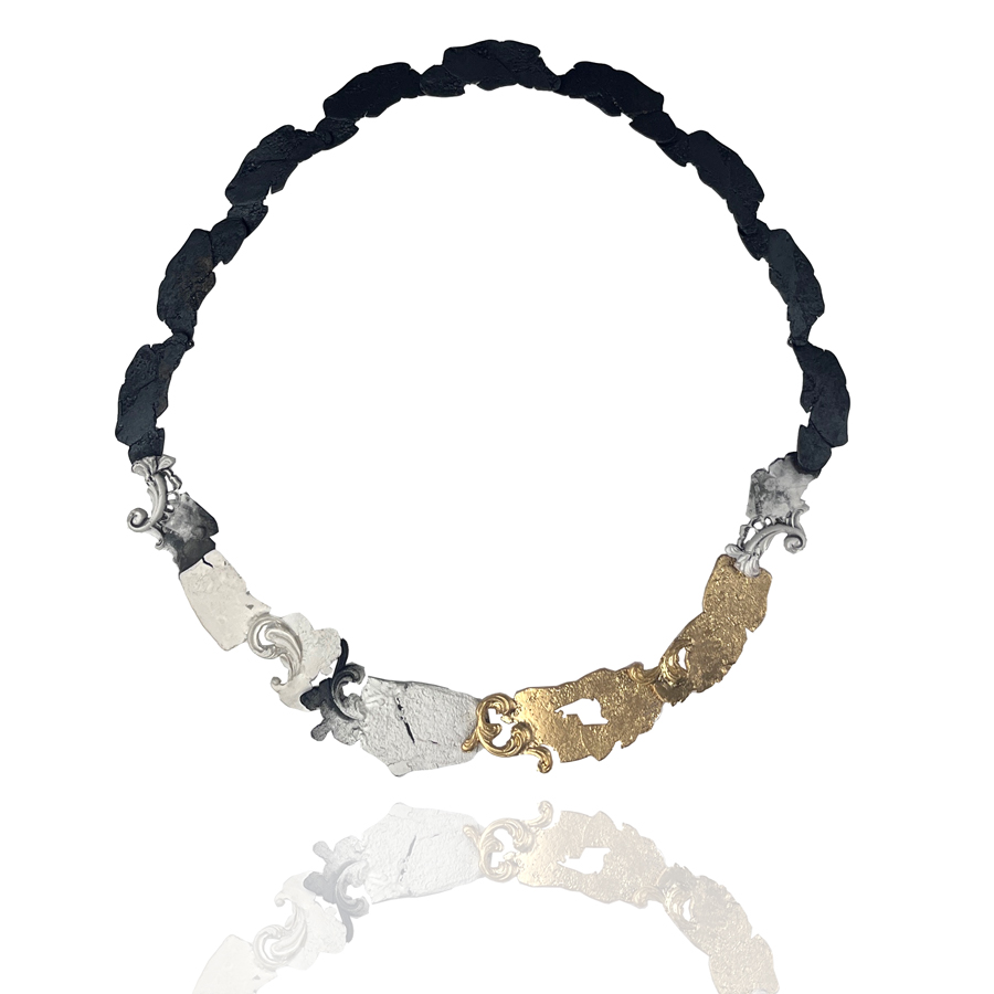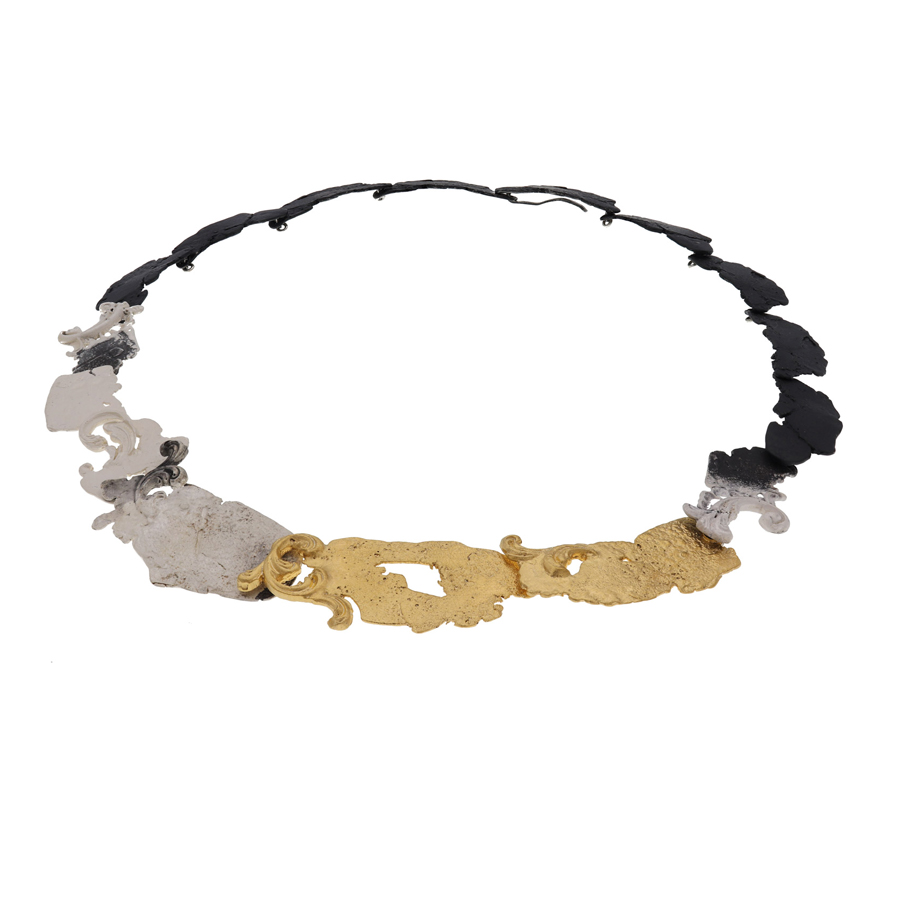 Girocollo in argento, ossidi e vernici ceramiche alcuni elementi sono placcati oro.