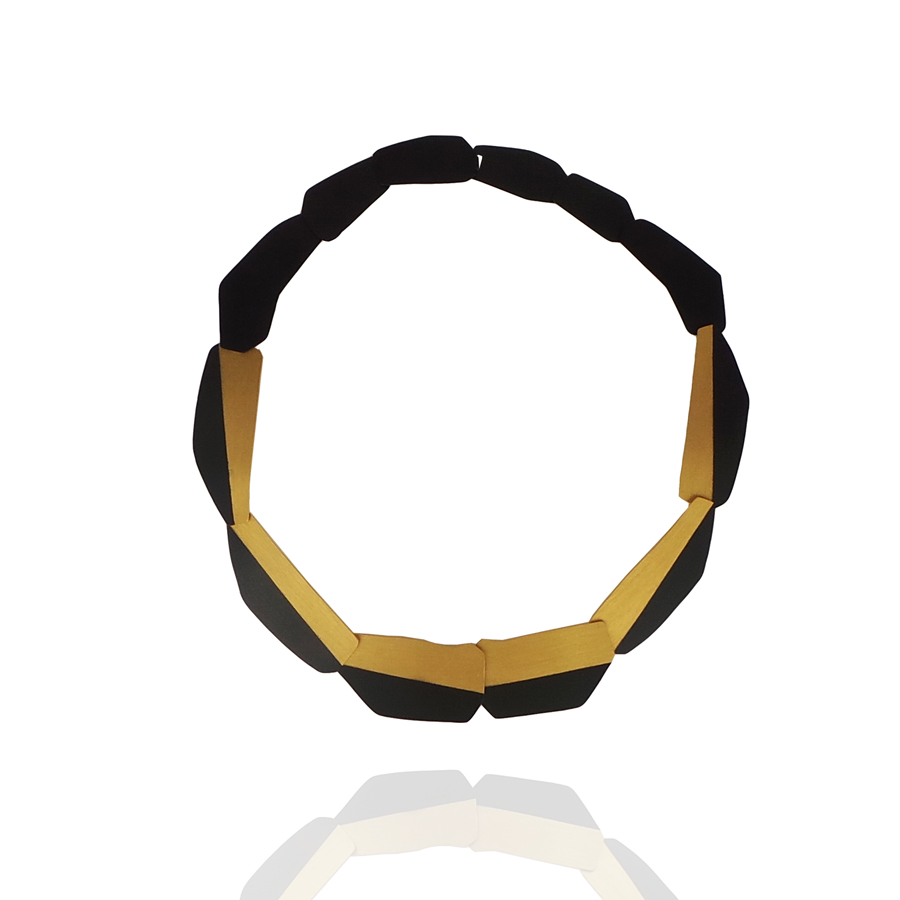 Elementi di varie misure verniiati e placcati oro. Lunghezza totale 47 cm circa. Chiusura a gancio a scomparsa.