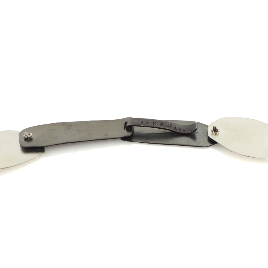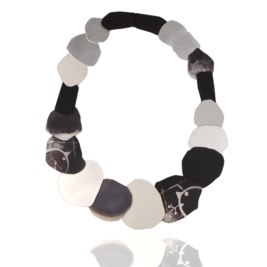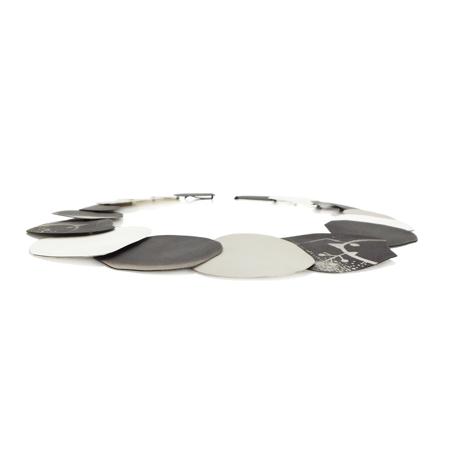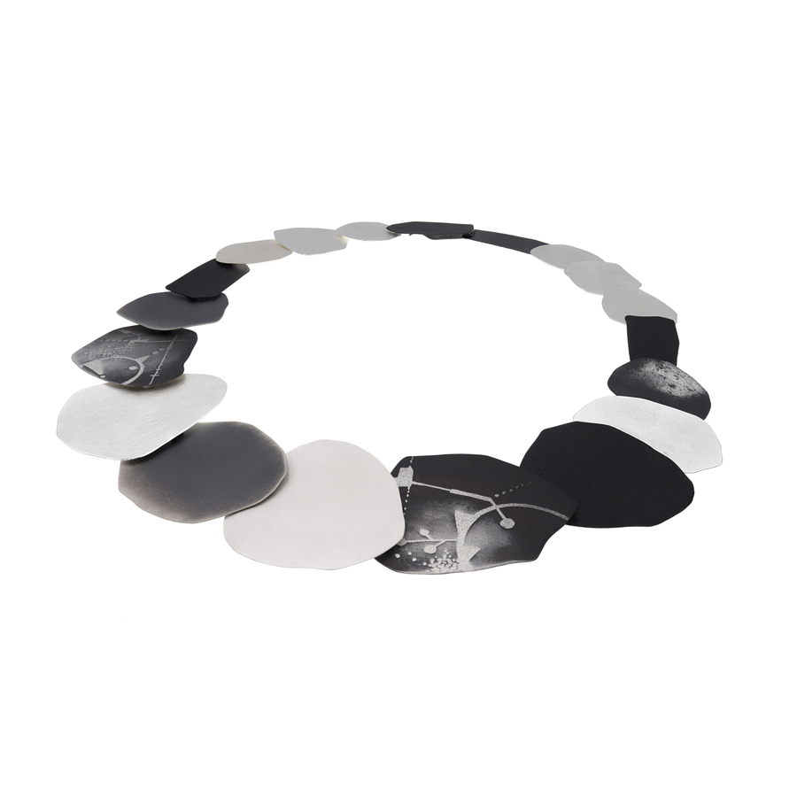 Collana composta da placche sovrapposteDecorazioni realizzate con vernici ceramiche su argentoChiusura nascostaArgento, vernici ceramicheLunghezza collana 54 cmPeso 65 gr