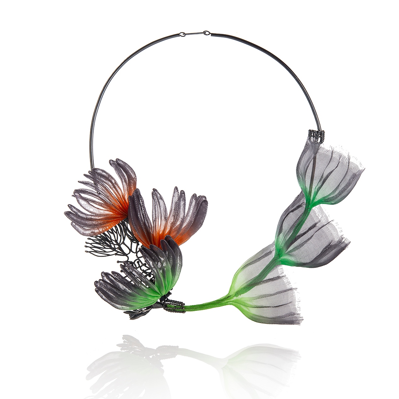 Jounghye Park è interessata a radici, steli, arbusti, bacche, semi: un vocabolario naturale che traduce in ornamento e che rimanda all’ambiguità delle piante nella loro volontà di radicarsi in un luogo e al contempo estendersi nello spazio con i semi: la leggerezza della seta evoca questo fluttuare.