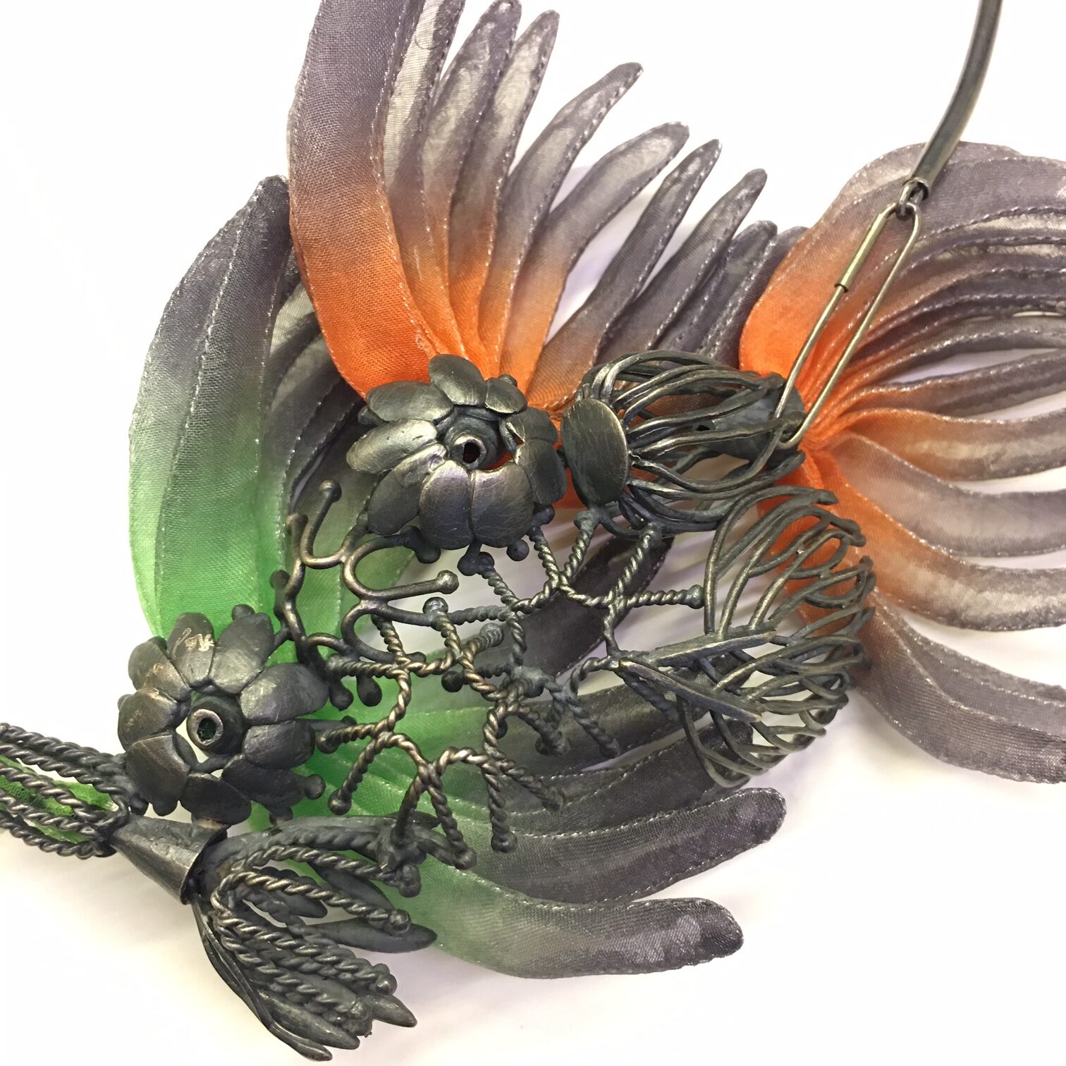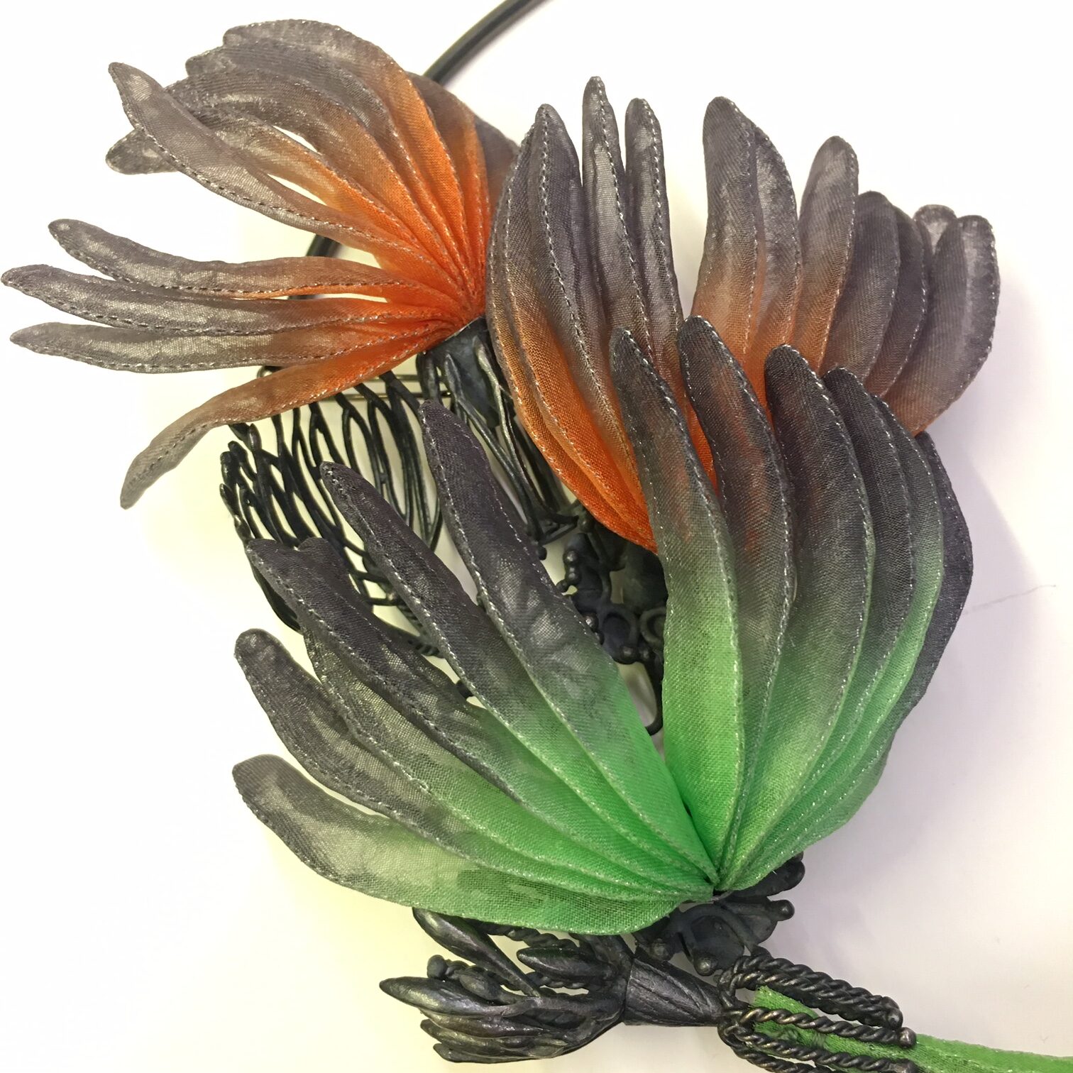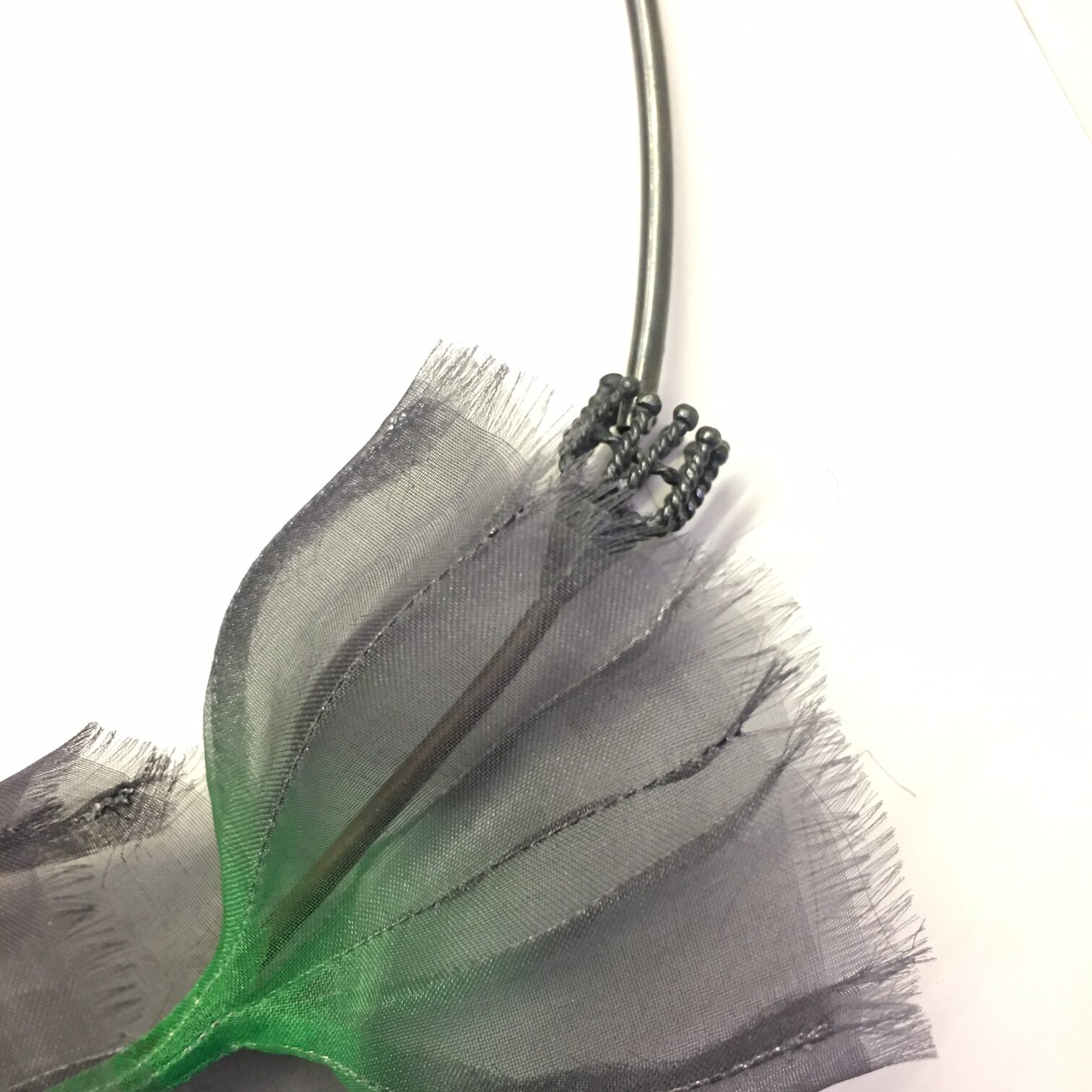 Gli elementi in seta avvolgono preziosi dettagli in argento, un intreccio di rami infiorescenze e piccole foglie che si scoprono con uno sgardo attento.