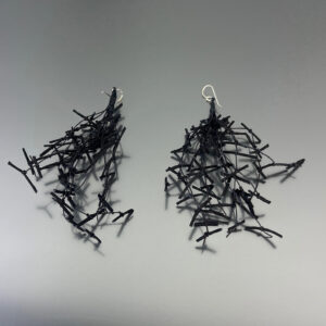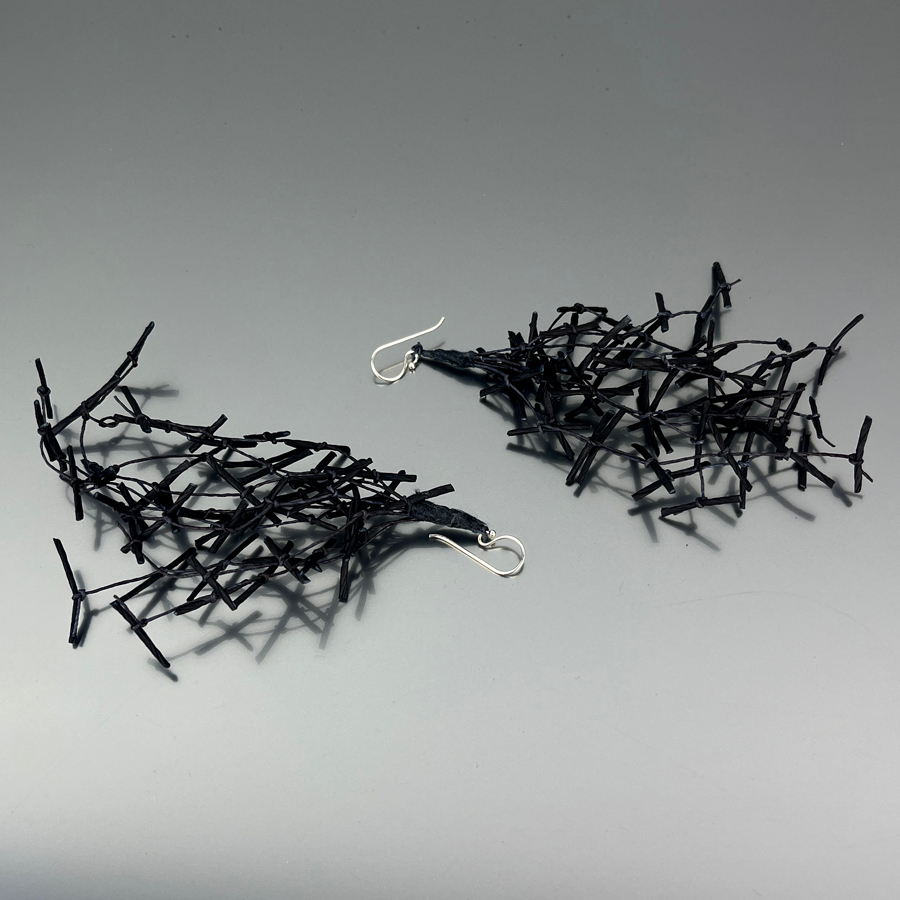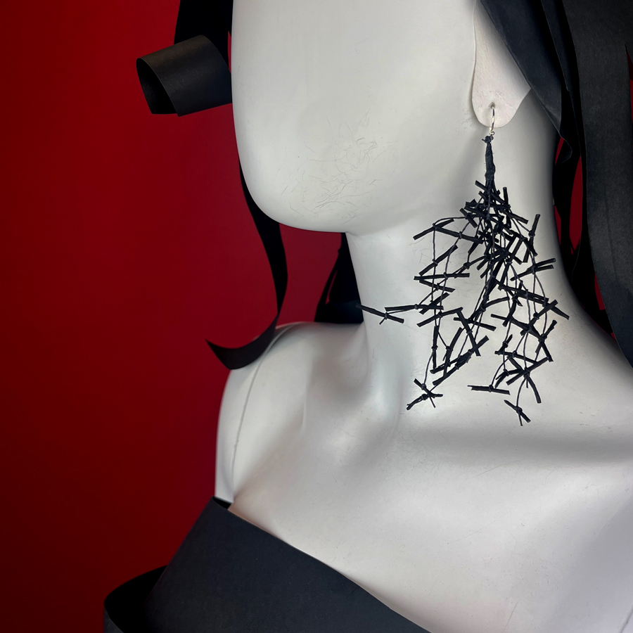 Orecchini leggeri e scenografici, costruiti con una fitta trama di piccoli elementi in carta e cordino.