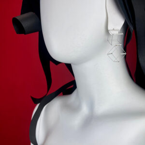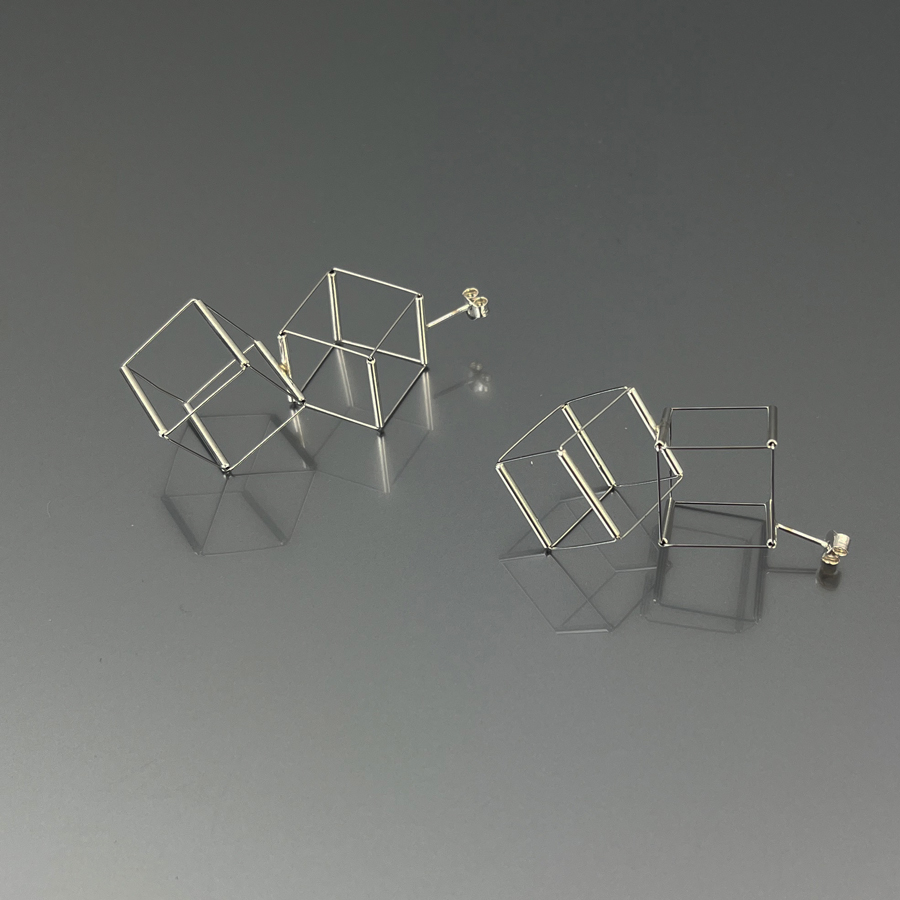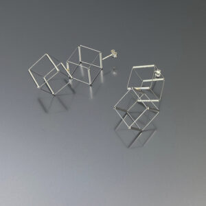 Orecchini caratterizzati da leggerezza ed essenzialità, in argento 925 e inox, formati da due cubi, uniti ma mobili