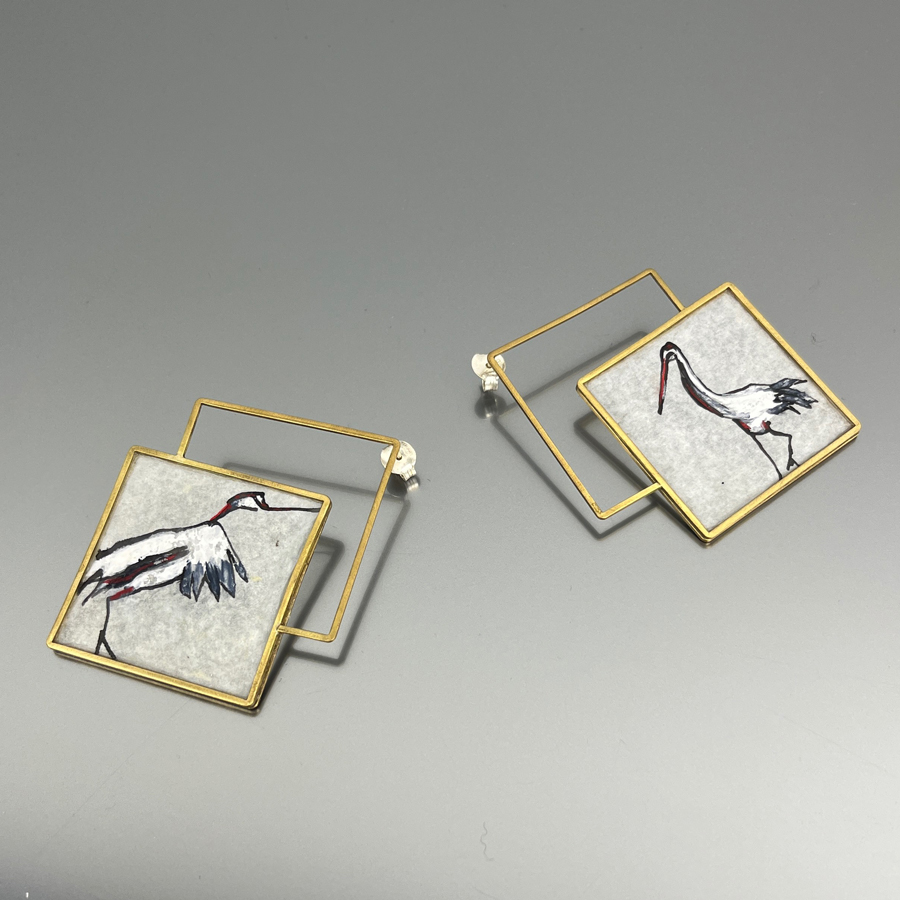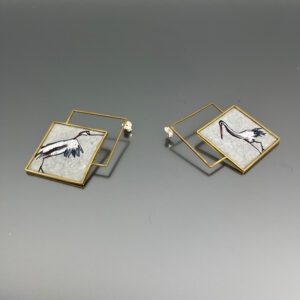 La collezione “Give crane a chance” nasce dopo un viaggio in Giappone, dove l’artista ha scoperto il gofun, pigmento bianco ricavato da ostriche polverizzate che viene da subito integrato nella sua ricerca pittorica applicata alla gioielleria.