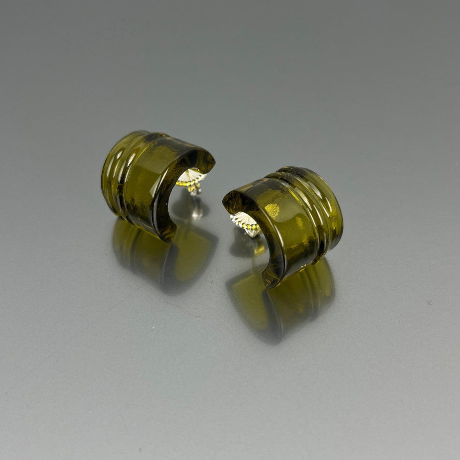 Orecchini realizzati trasformando a mano bottiglie di vetro.