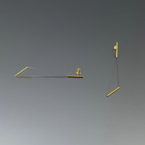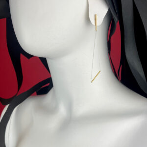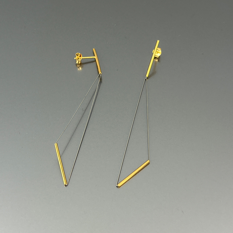 Orecchini dalla linea pulita ed essenziale, composti da due elementi di cui uno mobile in argento 925 placcato oro, uniti da cavetti in acciaio.