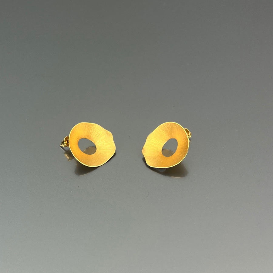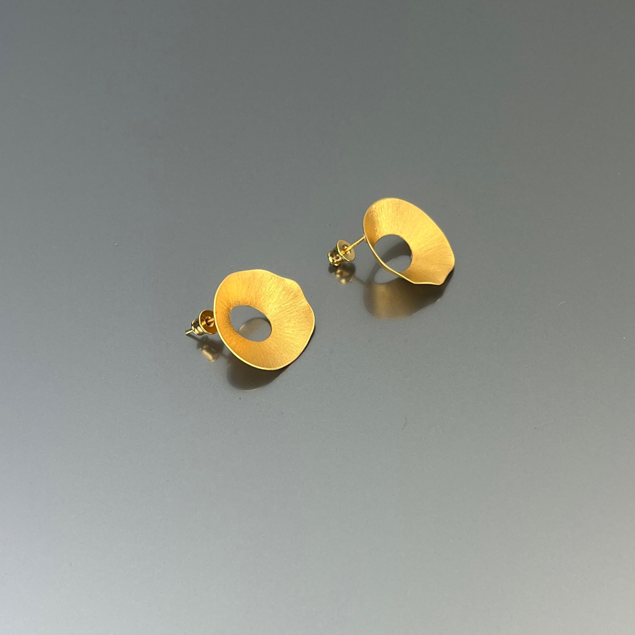 Un paio di orecchini: e la superficie si increspa in oro come se la forma fosse rimasta lì, sospesa, dopo un piccolo salto nell’invisibile.