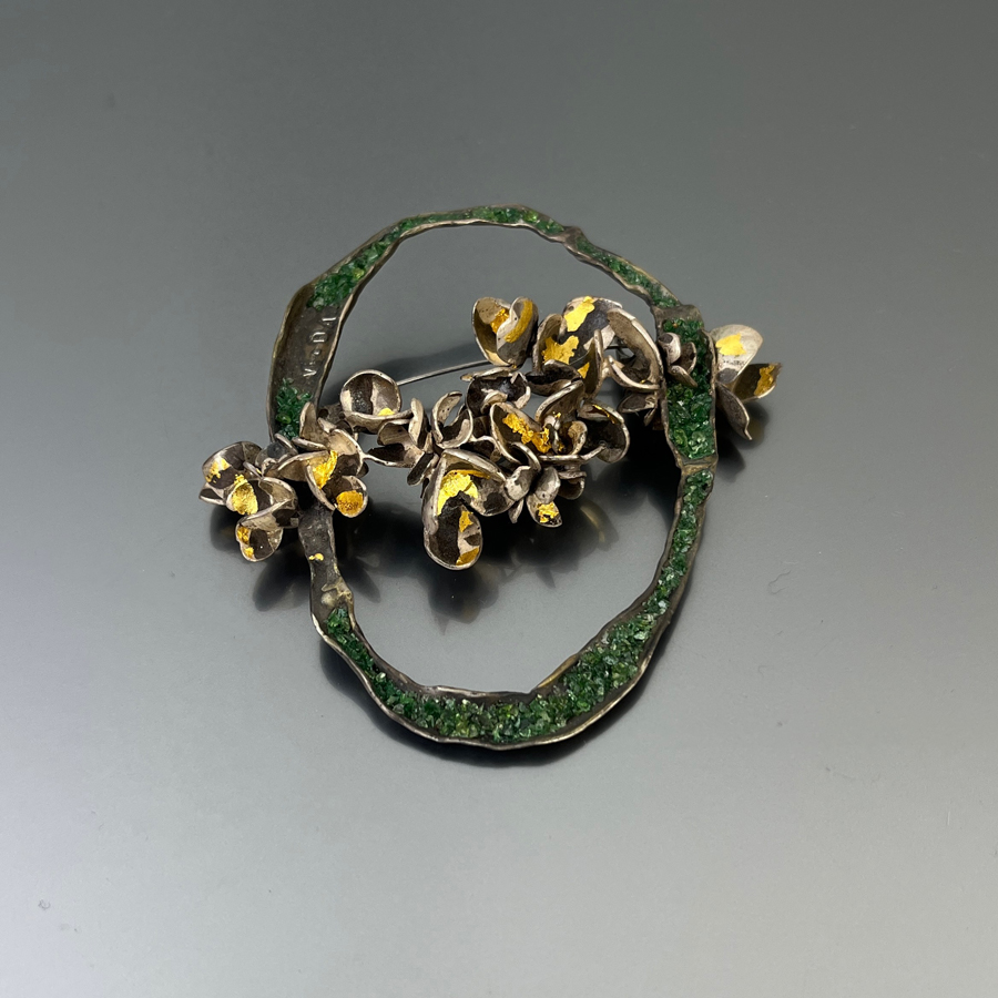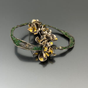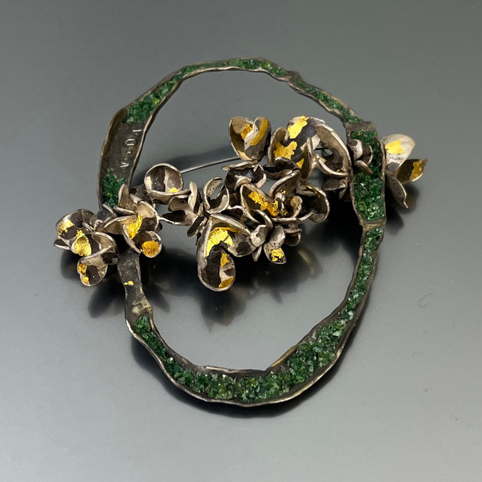 oggetto unico realizzato interamente a mano da Clara Del Papa. Argento con patine, oro e tormalina.
