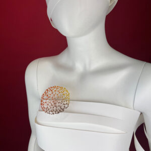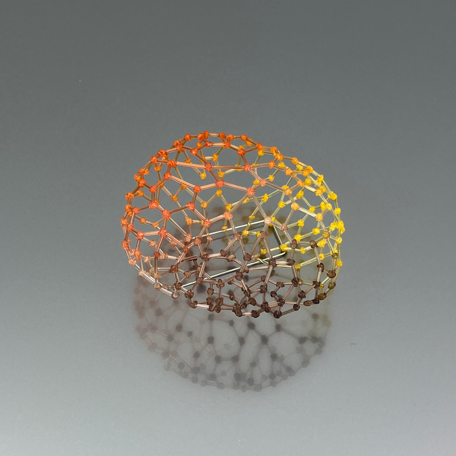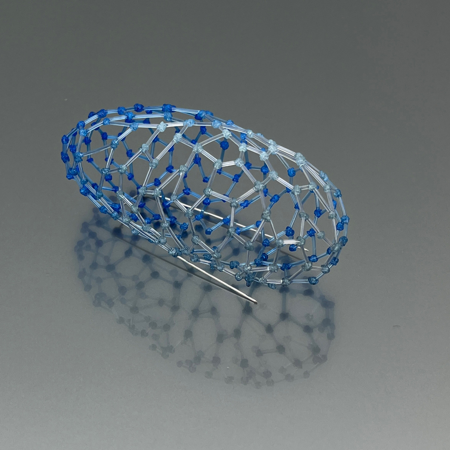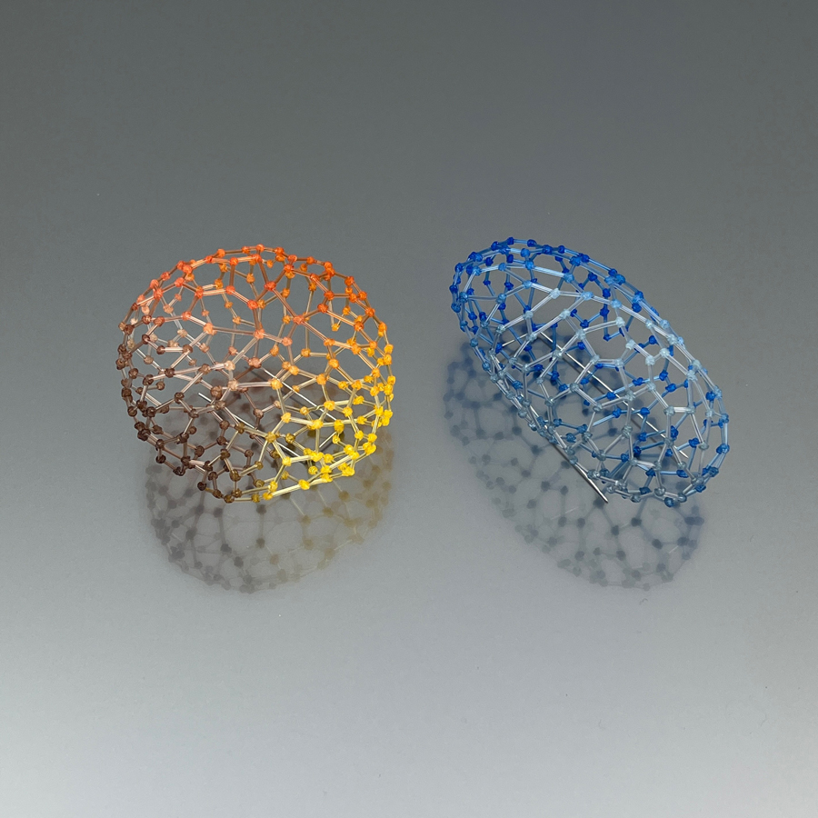 Floor ha sviluppato e padroneggiato un’ampia gamma di tecniche, dalla fusione all’intreccio e all’appiattimento del filo di nylon mediante l’uso del calore, dando luogo a reti dettagliate che le rendono possibile la costruzione di gioielli e oggetti, leggeri e resistenti, traslucidi e scintillanti.