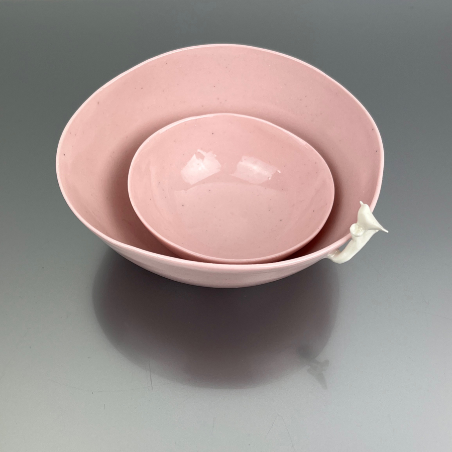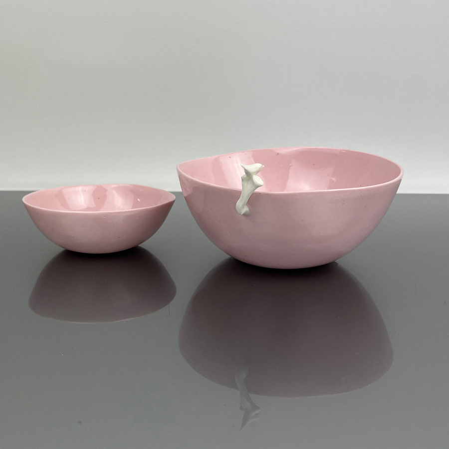 Set composto da due ciotolini dalla forma irregolare realizzati interamente a mano in porcellana pigmentata rosa.