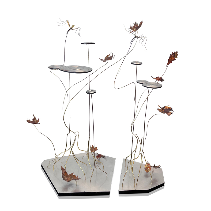 Installazione composta da due elementi in ottone lavorato, rame brunito con patine, alluminio e legno.