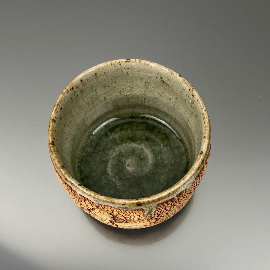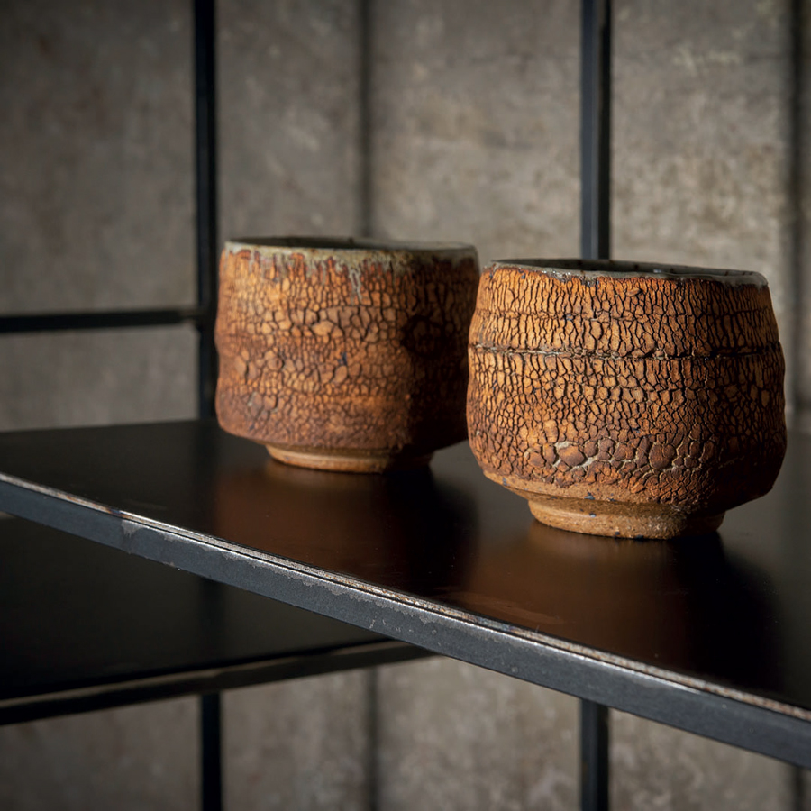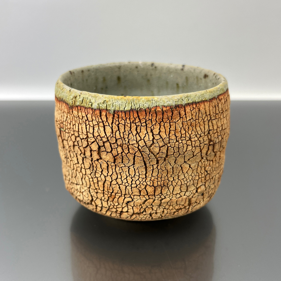 Tazza da tè realizzata da Terry Davies con la sua particolare tecnica che rende la superficie dei suo manufatti come terra spaccata o “pelle di elefante”