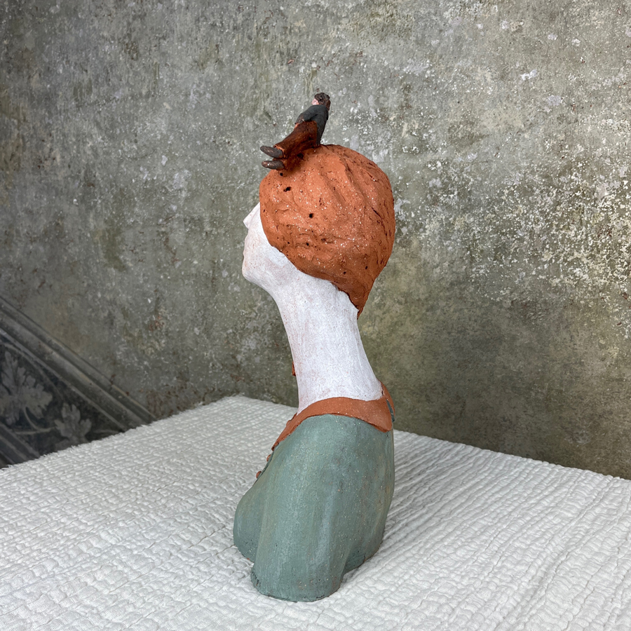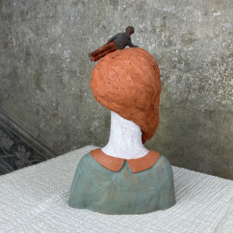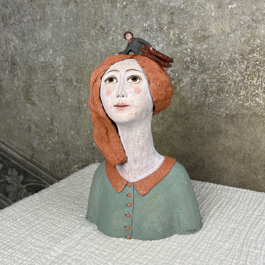 Qualcosa in testa è un pezzo unico realizzato da Enrica Campi da sempre affascinata dai soggetti femminili, queste sculture danno lo spunto per molte interpretazioni.