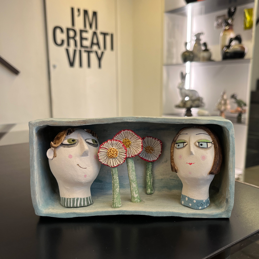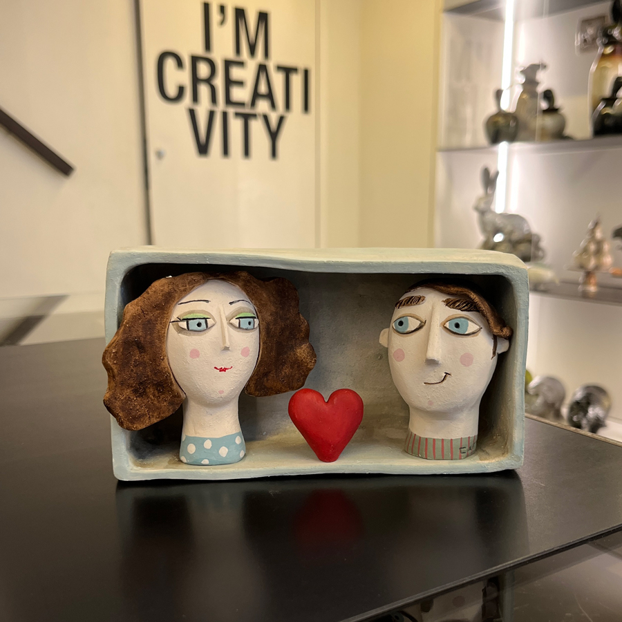 Le storie d’amore prendono forma nei delicati Box in ceramica di Enrica Campi, piccole scene racchiuse in scatole artigianali che catturano emozioni e sguardi. Queste opere uniche, interamente realizzate e dipinte a mano, raccontano l’incontro tra due anime, il gesto di un dono, la magia di un cuore che unisce.