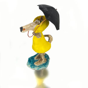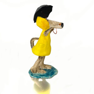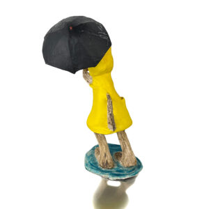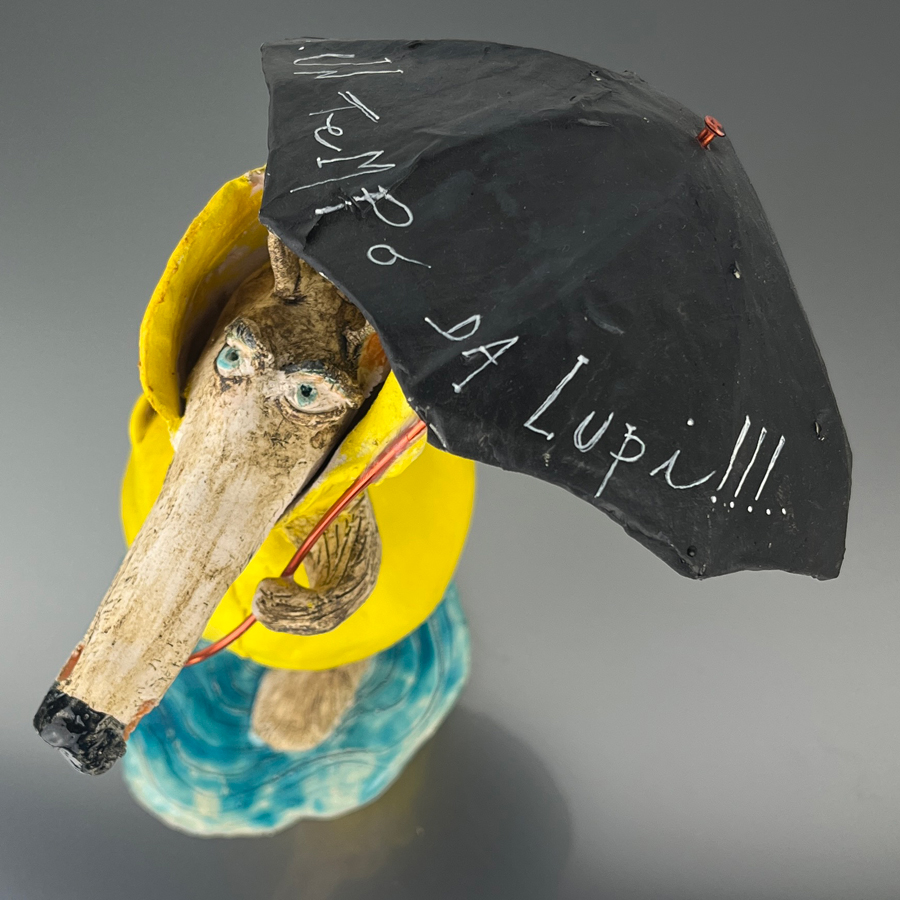 Scultura in ceramica modellata e decorata interamente a mano, ombrello in cartapesta e manico in rame