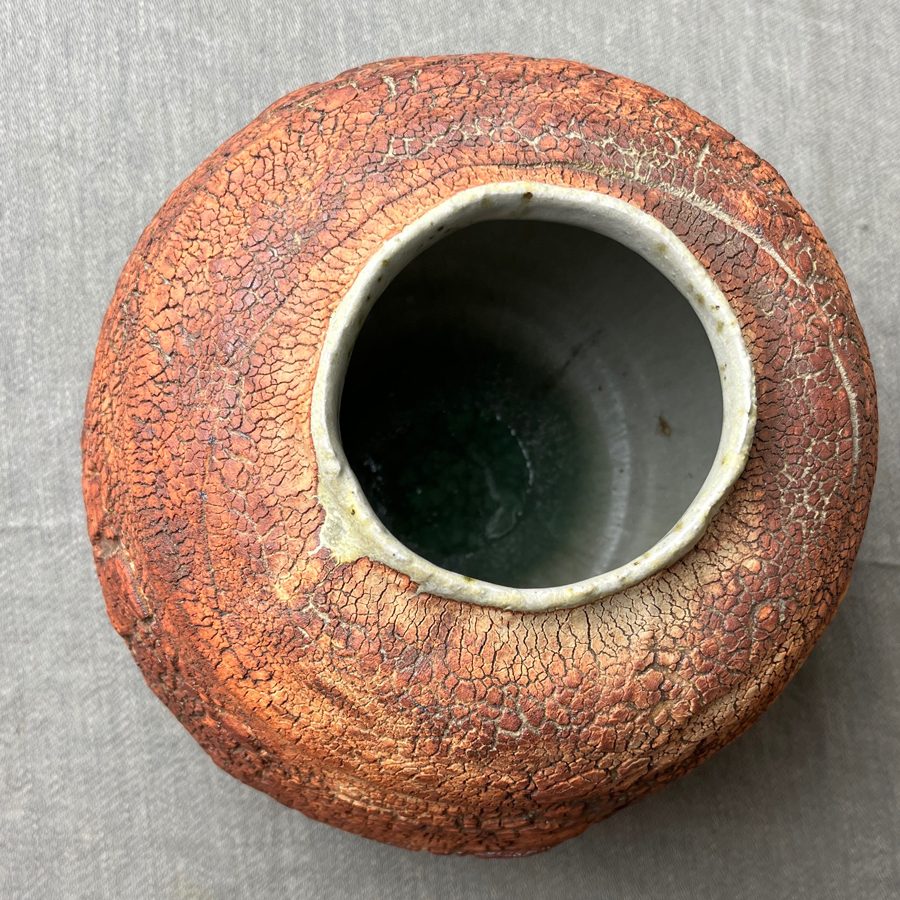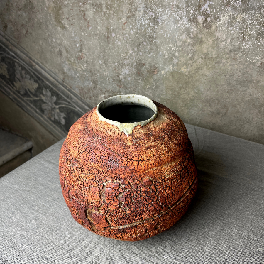e realizzato al tornio da Terry Davies con la sua particolare tecnica che rende la superficie dei suoi manufatti come terra spaccata o “pelle di elefante”