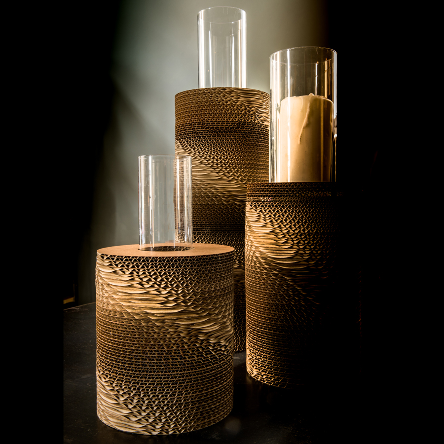 Il progetto realizzato in cartone doppia onda gioca con sovrapposizione, volume e forma della materia.