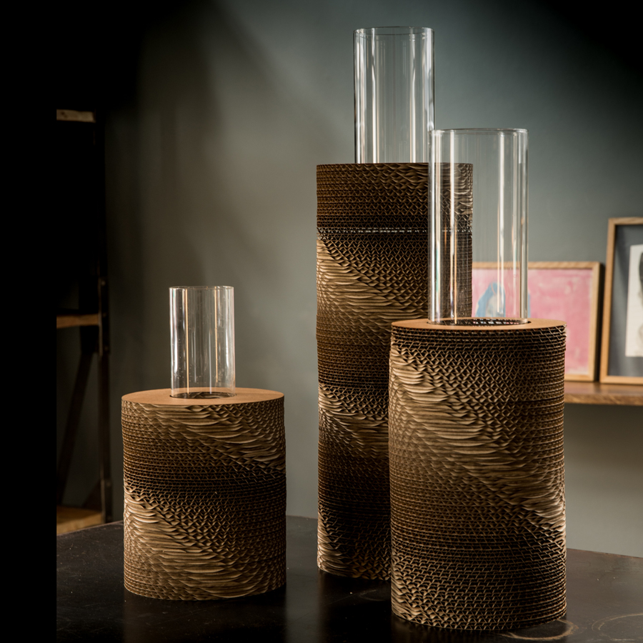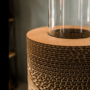 Il cartone è un materiale povero, utilizzato per imballare e proteggere altri oggetti; questo progetto lo rende protagonista esso stesso. Il cartone viene assemblato a mano, incollato e trattato.