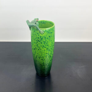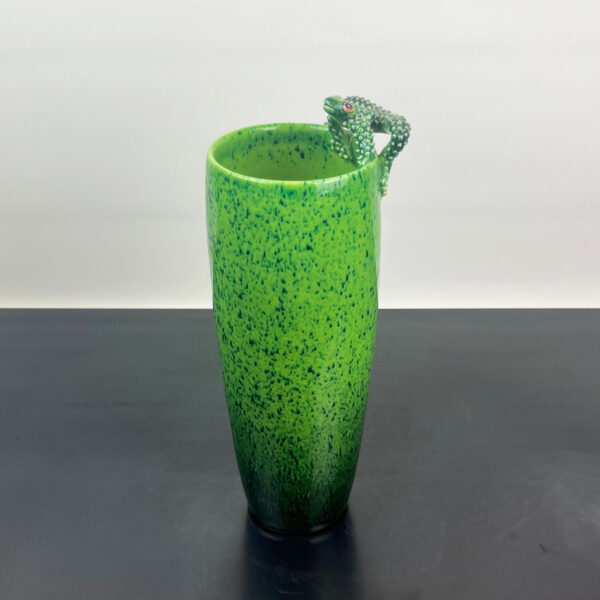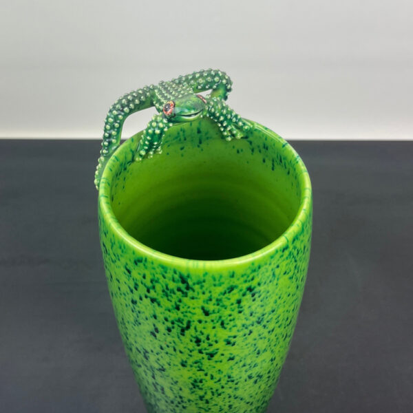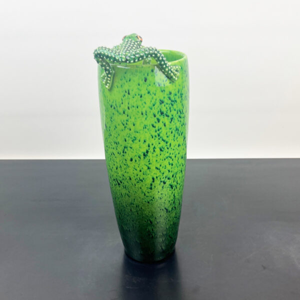 Vaso scultura con rana, realizzato interamente a mano nella bottega di Mirta Morigi a Faenza.